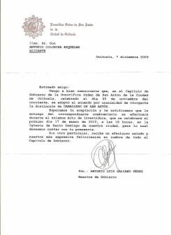 Esperamos tu aceptación y te notificamos que la entrega del correspondiente nombramiento se efectuará durante el solemne Acto de Investidura, que se celebrará el próximo día 17 de enero de 2010, a las 18 horas, en la Iglesia de Santo Domingo de nuestra ciudad, para lo cual deseamos contar con tu presencia.