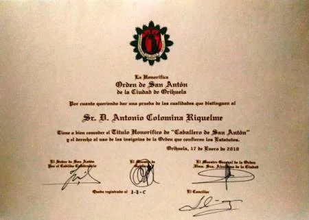 Tengo a bien comunicarte que, en el Capítulo de Gobierno de la Honorífica Orden de San Antón de la Ciudad de Orihuela, celebrado el día 25 de noviembre del corriente, se adoptó el acuerdo por unanimidad de otorgarte la distinción de CABALLERO DE SAN ANTÓN.
