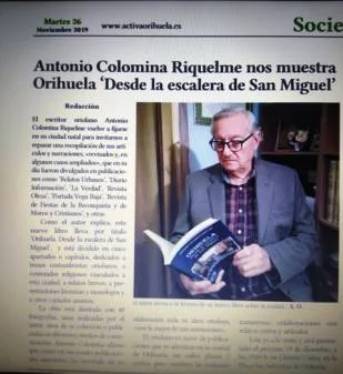 Antonio Colomina Riquelme acaba de publicar un nuevo libro, "Orihuela, sus calles, sus plazas, sus gentes': mientras que todavía resuena el éxito conseguido con su anterior trabajo, "Orihuela, Dulce Pueblo': Antonio Colomina nació en Orihuela, en 1940. Siendo muy joven se traslada a Madrid para estudiar y trabajar al mismo tiempo. Más tarde obtiene plaza como funcionario del Estado y trabaja en diversas ciudades como Madrid, La Línea de la Concepción, Algeciras o Cáceres, hasta que recala en Alicante, donde reside actualmente. Estudió teología, pedagogía y didáctica de la en-señanza; es profesor de religión y moral católica, profesor deportivo, operador radiotelegrafista de primera y radiotelefonista naval. Es diplomado por la Universidad de Alicante por unos cursos de Prensa, Radio y Televisión, Periodismo Digital, Periodismo de Investigación y Creación narrativa. Ha publicado centenares de artículos en periódicos y revistas impresas y digitales. Es administrador de tres páginas Web, "Orihuela en mis Artículos", "El Gallo del Alba en Alicante" y "Los Relatos de Antonio Colomina". Es miembro de la Asociación de Escritores y Artistas españoles (AEAE) y de la Red Mundial de Escritores en Español (REMES).