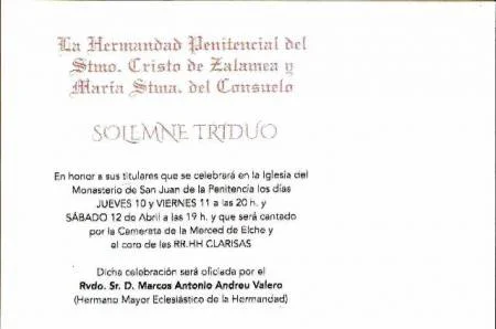 Con motivo de la próxima celebración de la Semana Santa en la Hermandad del Stmo. Cristo de Zalamea y María Stma. del Consuelo tenemos previsto celebrar un Concierto Oración titulado “Tenebrarum Silentium” y el tradicional Triduo en honor de nuestros titulares en los días previos al Domingo de Ramos, acompañando invitación a dichos actos.